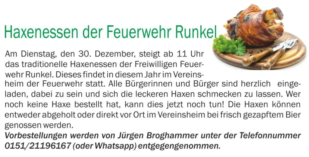 Dienstag, den 30.12.2025 ab 11:00 Uhr im Vereinsheim der FW Runkel Vorbestellungen an Jürgen Brogkammer unter derTelefonnummer (0151) 2119 6167oder per Whatsapp
