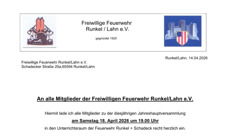 EILMELDUNG! Die für morgen, Samstag den 18. April 2026 geplante Jahreshauptversammlung der Feuerwehr Runkel fällt…
