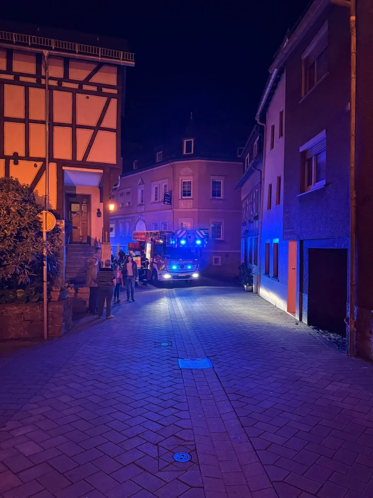 Der Rettungsdienst forderte unsere Unterstützung an, um einen Patienten mit der Drehleiter aus der Wohnung zu retten. Da die Fenster des Gebäudes in der Runkeler Altstadt zu eng für eine Rettung aus dem 2. OG waren, retteten wir die erkrankte Person mit Hilfe einer Schleifkorbtrage, Leinen und viel Geschick über das auch sehr enge und steile Treppenhaus.